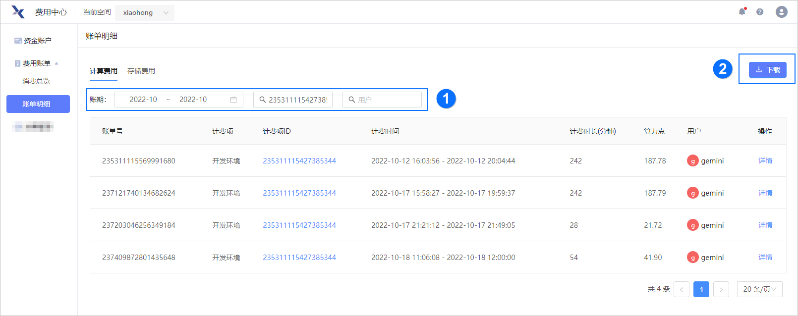 平台费用中心,支持查看费用账单 消费总览 以及 账单明细 导出。