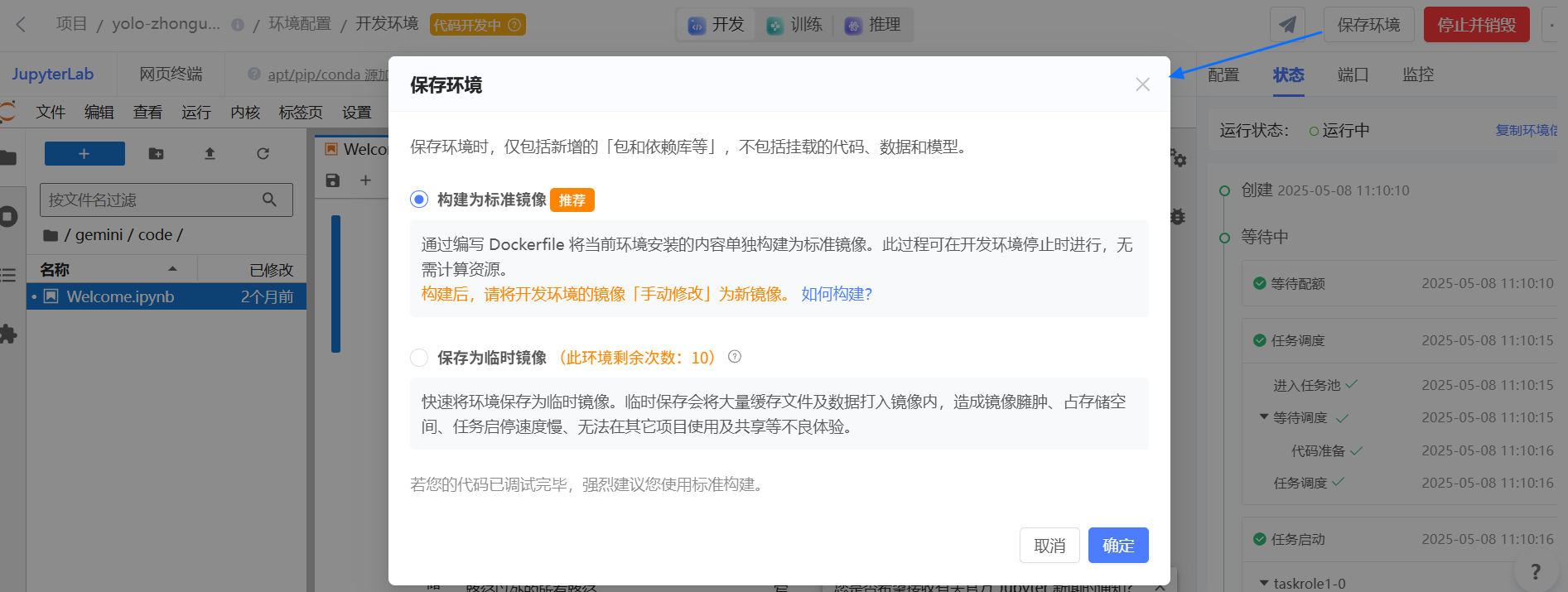 说明:将开发环境保存为镜像仅针对研发依赖的环境即系统和工具等,不包括数据和代码等 AI 资产信息。