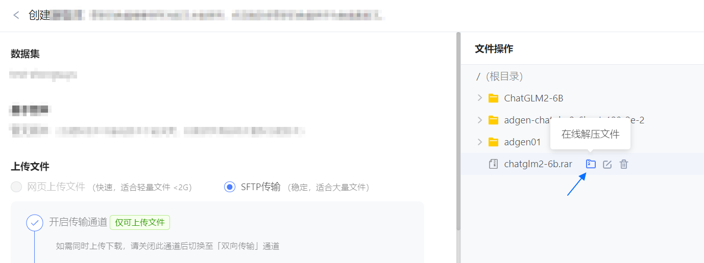 上传的数据集中如有压缩文件,支持一键解压缩到当前路径。