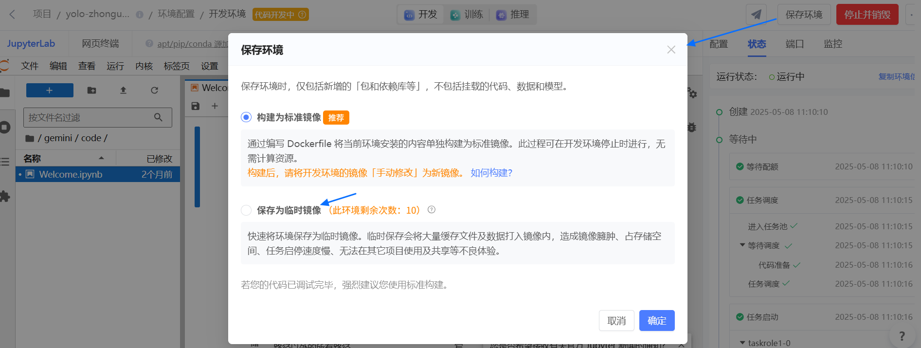 如后续需持续使用 git 进行代码提交等管理代码版本及分支,可选择 保存环境> 保存为临时镜像,将 git 的安装及配置永久写入开发环境。